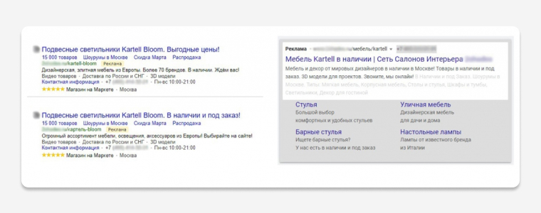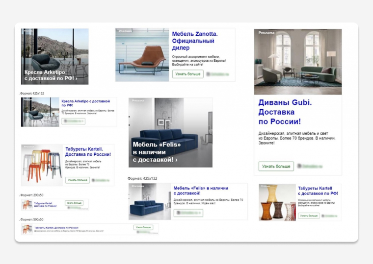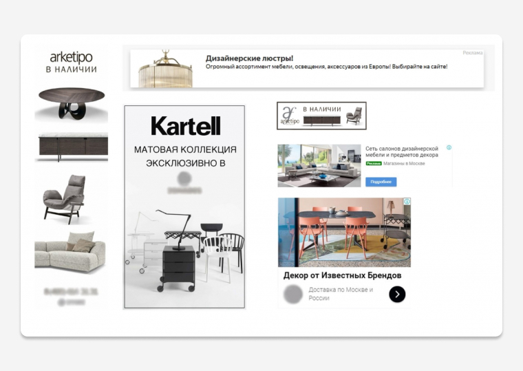 Конкуренция в нише дизайнерской мебели в Москве высокая: у покупателя есть предложения десятков онлайн- и офлайн-магазинов со скидками и бонусами. Одного контакта с поисковой рекламой недостаточно, чтобы склонить к покупке. Для многократных касаний с аудиторией, уже проявившей интерес, настроили смарт-баннеры в Яндекс Директе и повторные показы с графическими объявлениями в контекстно-медийной сети Google.